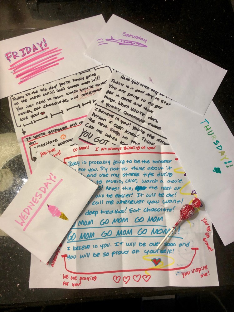 Our oldest daughter packed a letter a day for me, which brought me such joy. I see chocolate seems to be a running theme in her tips for me (she knows me so well!).