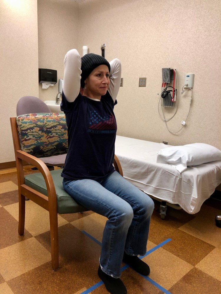 - First physical therapy session of the day. We work on sitting to standing – using the breath and putting the burden on the muscles that are supposed to engage in this movement. My upper arms and upper legs do the vast majority of the work – hence, the pain and shaking – when it’s supposed to be loading the feet with your weight and letting your core carry you through the motion. I can’t begin to explain what it’s like to try to rethink such simple things! I started to get the sit to stand with some smoothness (and weirdness, which is good).