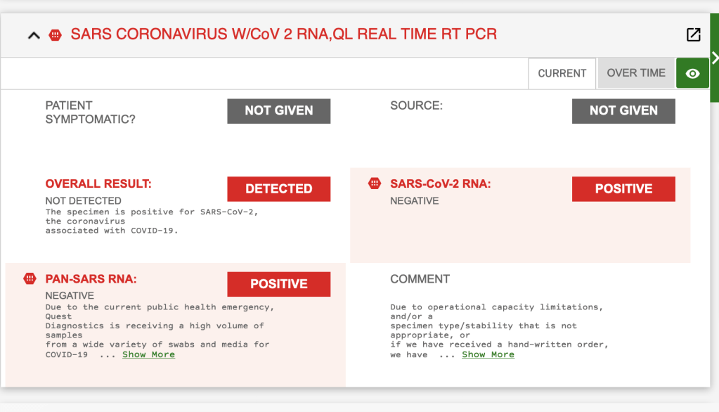 At about 10 o’clock on March 27th, I had a lab test pop up in my inbox. I wasn’t sure what to make of it. All of these SARS tests were red and marked positive.